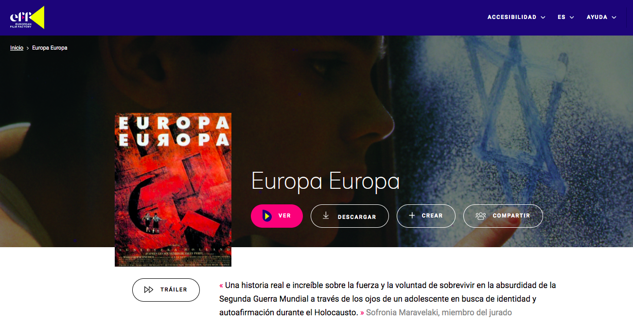 European Film Factory es un proyecto de educación cinematográfica cuya plataforma en línea multilingüe brinda a profesores y estudiantes europeos de entre 11 y 25 años, así como a mediadores culturales, acceso a un catálogo de películas del patrimonio europeo, junto con programas de cortometrajes contemporáneos y temáticos. Las películas están acompañadas de recursos educativos y la plataforma cuenta con herramientas interactivas que permiten a los estudiantes participar activamente en actividades de educación cinematográfica.