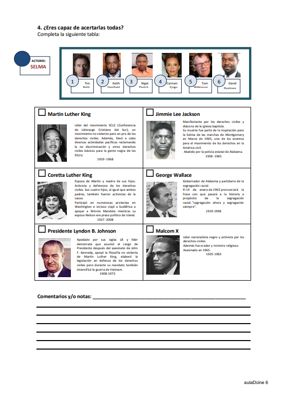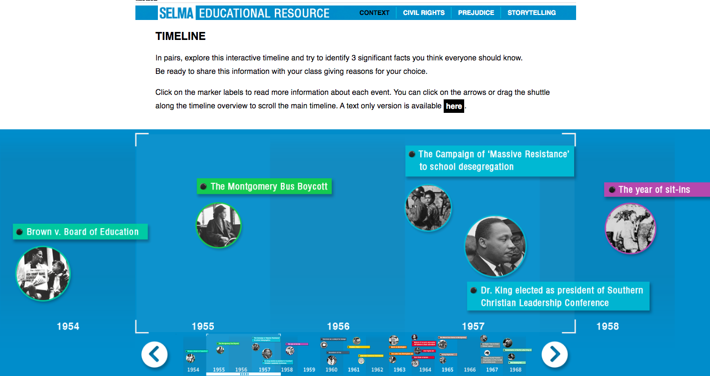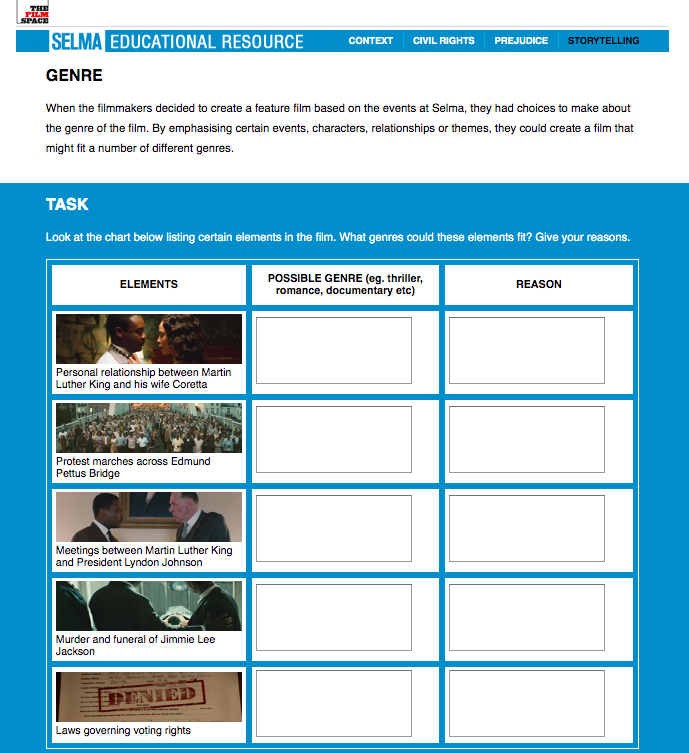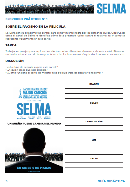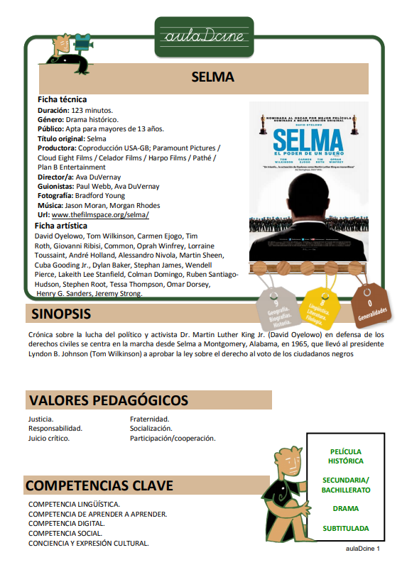 El recurso online de The Film Space basado en la película de Ava DuVernay propone una serie de interesantes actividades interactivas (en inglés) adaptadas al currículo escolar que abarca los diferentes aspectos de Selma. Está diseñado principalmente para alumnos de Historia, Inglés, Valores cívicos y éticos, de entre 13 y 18 años.
