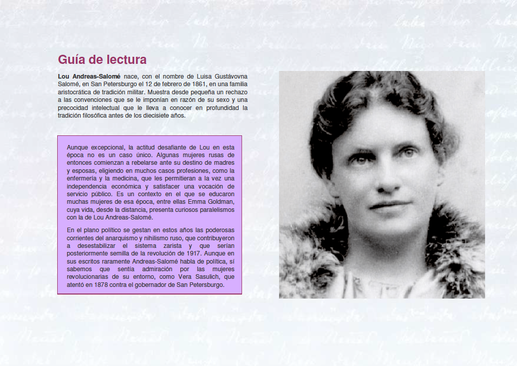 Este documento es un complemento a la película sobre la fascinante historia de Lou Andreas-Salomé, que además ha sido especialmente recomendada por el ICAA para el fomento de la igualdad de género.