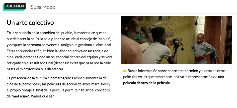 - Reflexionar sobre la idea del cine como experiencia de creación colectiva y también aprender el concepto de "metacine" a través del rodaje que Jo organiza en su pueblo.