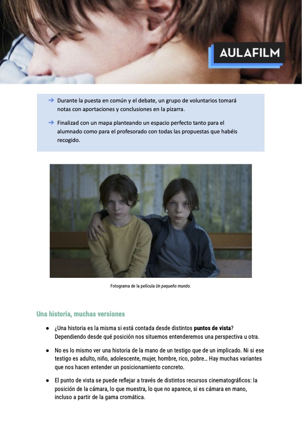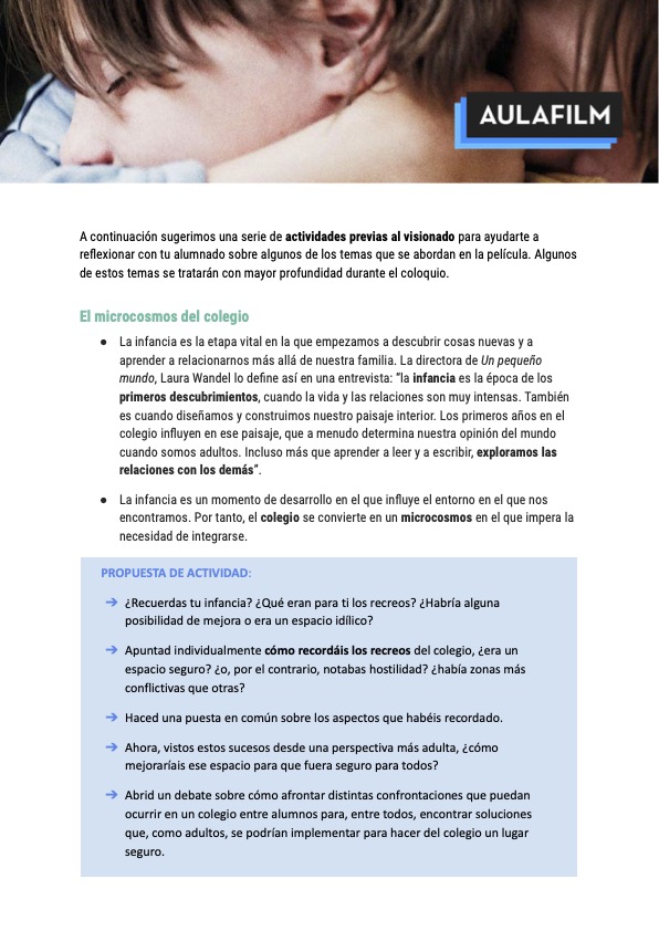 A través de esta ficha didáctica podrás trabajar con tu alumnado una serie de actividades previas al visionado de la película cuyos objetivos didácticos son: analizar la infancia y el colegio como lugar de socialización; sensibilizar sobre el acoso escolar para su prevención; reflexionar sobre el punto de vista en el cine y entender el cine como agente concienciador.
