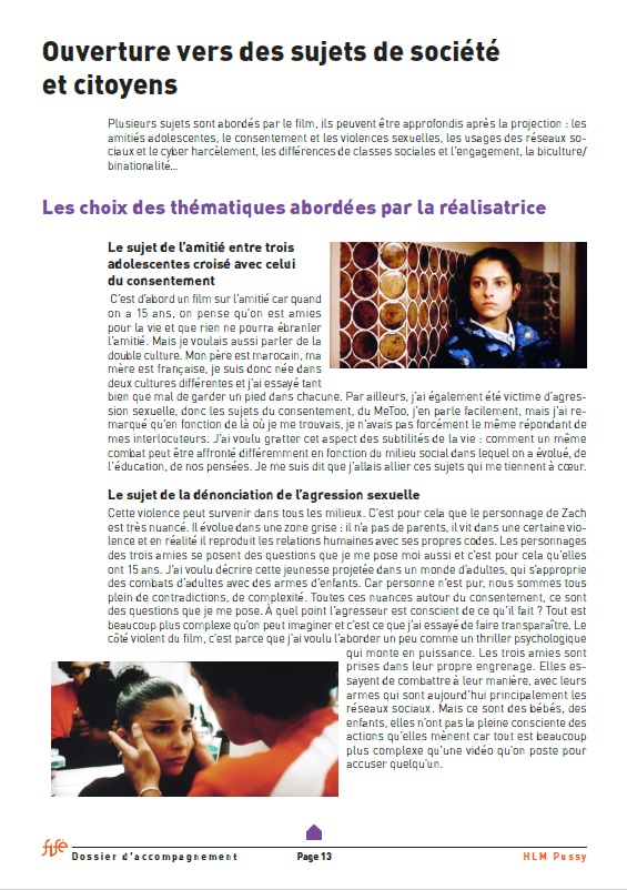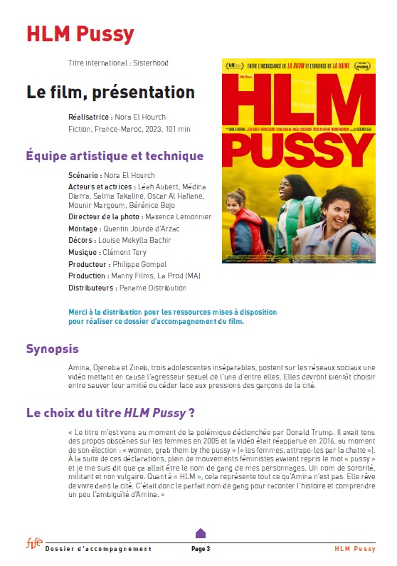 HLM Pussy se acerca a cuestiones de absoluta relevancia como el consentimiento, el poder de las redes sociales, la sororidad y la realidad de las familias de origen migrante con una mirada y una energía propias de la adolescencia, entre lo ingenuo y lo combativo. Una película perfecta para abrir un debate enriquecedor en el aula.
