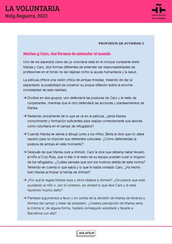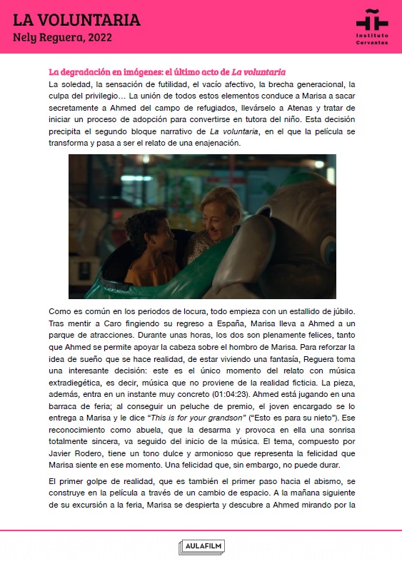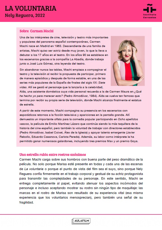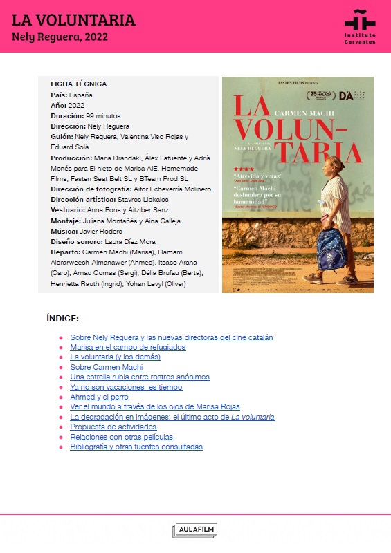 Esta guía pedagógica de La voluntaria forma parte de una colección de materiales didácticos elaborados para profundizar en el análisis de una selección de películas clásicas y contemporáneas del cine español. Han sido elaboradas por Aulafilm para el Cineclub virtual de la Red de Bibliotecas del Instituto Cervantes: un espacio para el debate y el aprendizaje entre amantes del cine de todo el mundo que propone el visionado de una programación de películas online para debatir a distancia, con encuentros moderados por expertos y guías que acompañan cada uno de los títulos.