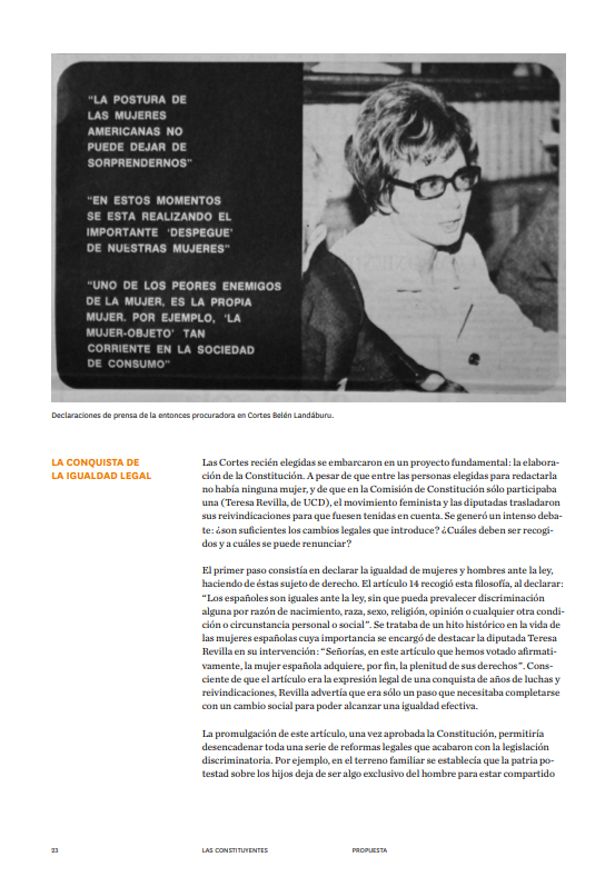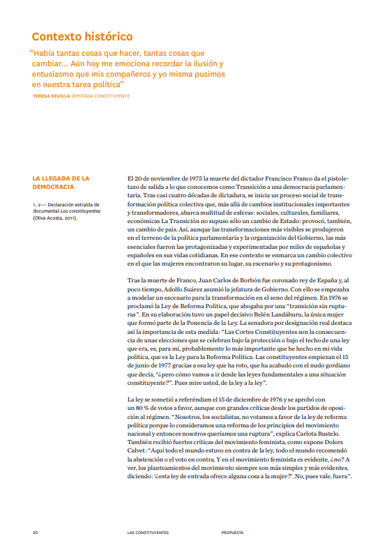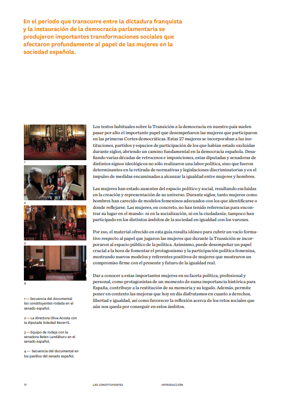Documental sobre las 27 mujeres, diputadas y senadoras, que desde su trabajo parlamentario en la legislatura constituyente de 1977, fueron protagonistas del cambio político hacia la democracia en España. A través de la experiencia personal de estas pioneras, se narra una parte apasionante de la historia de la participación política de las mujeres en España, y se analiza la situación actual a través de un intenso debate entre diputadas y políticas actuales con algunas de las mujeres constituyentes.
