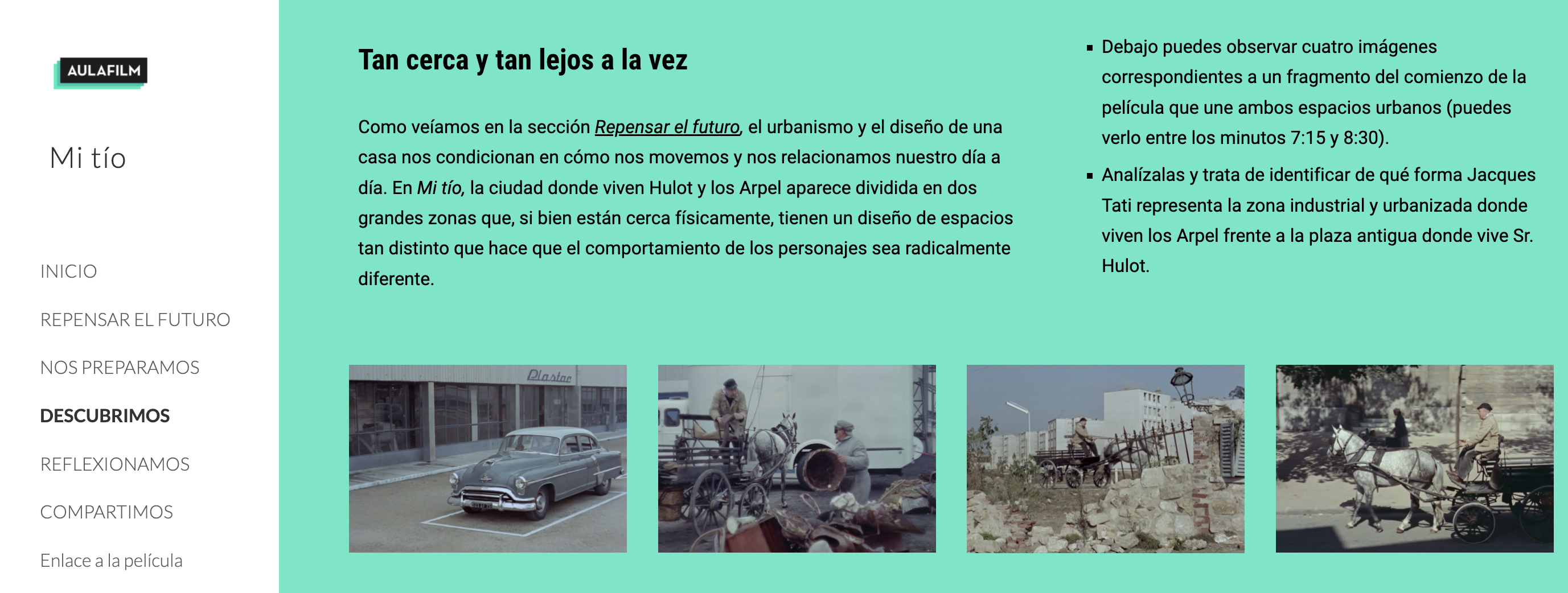 Esta guía pedagógica ha sido elaborada en el marco del programa Repensar el futuro impulsado por la Red PLANEA de Arte y Escuela en Andalucía con Aulafilm. Se dirige a los niveles de ESO, Bachillerato y ciclos formativos con el fin de profundizar en la película Mi tío de Jacques Tati.