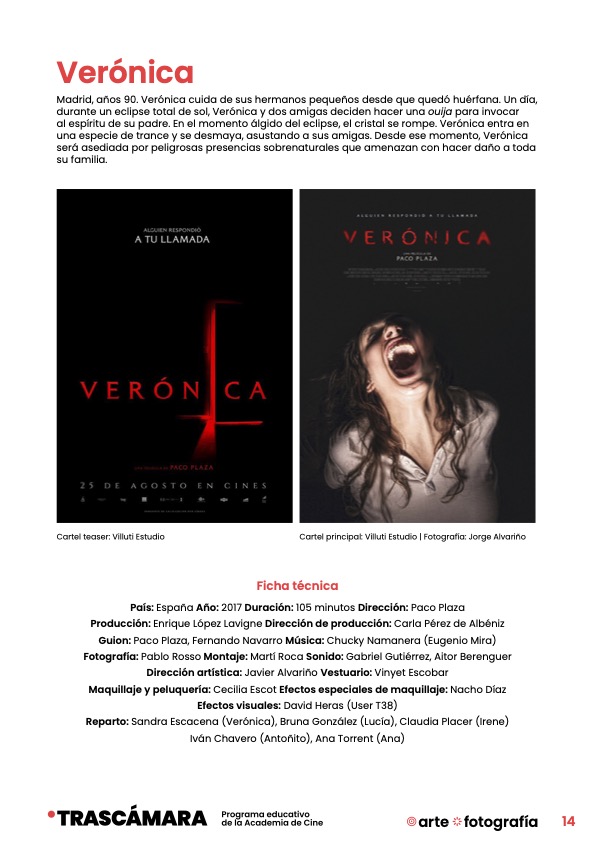 Esta guía aborda las profesiones de Dirección de Arte y Dirección de Fotografía a través del análisis de Verónica (Paco Plaza, 2017), y busca ofrecer a profesorado y estudiantes una herramienta para aproximarse a los oficios del cine entendidos como profesión, creación colectiva y expresión artística.