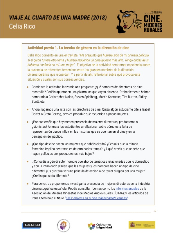 La guía pedagógica de Viaje al cuarto de una madre busca acercar a las y los jóvenes representaciones diversas de las mujeres en el entorno rural y promover el desarrollo de una mirada crítica y reflexiva sobre el tratamiento de sus personajes en el cine. Forma parte de los materiales de la Sección Educativa del Ciclo Nacional de Cine y Mujeres Rurales, impulsada por el Ministerio de Agricultura, Pesca y Alimentación y facilitada por Aulafilm.