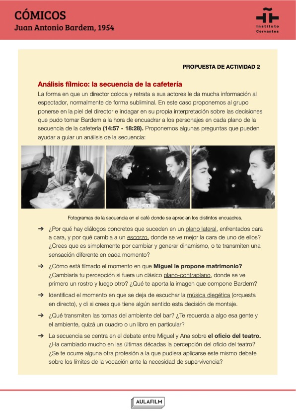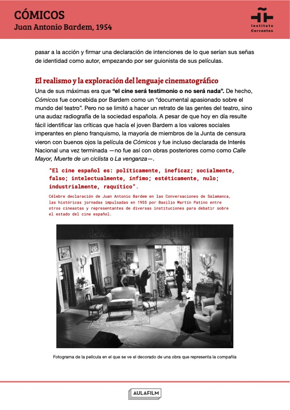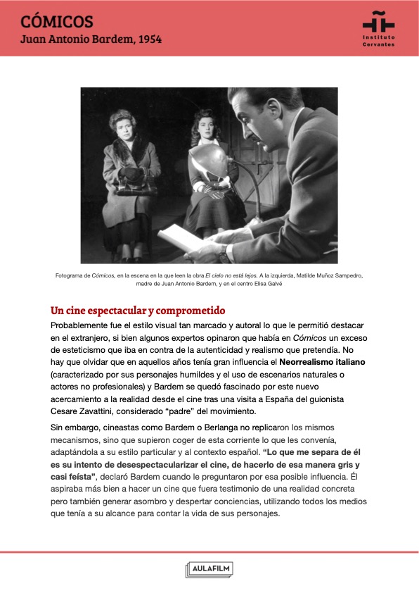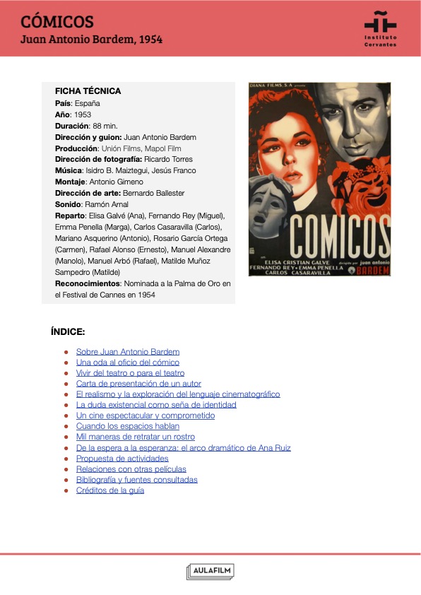 Esta guía pedagógica de Cómicos forma parte de una colección de materiales didácticos elaborados para profundizar en el análisis de una selección de películas clásicas y contemporáneas del cine español. Han sido elaboradas por Aulafilm para el Cineclub virtual de la Red de Bibliotecas del Instituto Cervantes: un espacio para el debate y el aprendizaje entre amantes del cine de todo el mundo que propone el visionado de una programación de películas online para debatir a distancia, con debates moderados por expertos y guías que acompañan cada uno de los títulos.