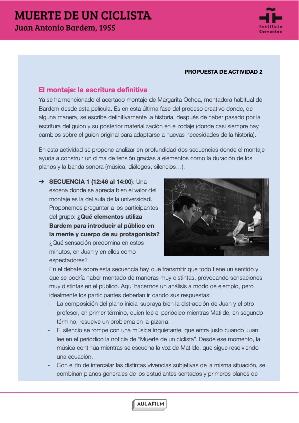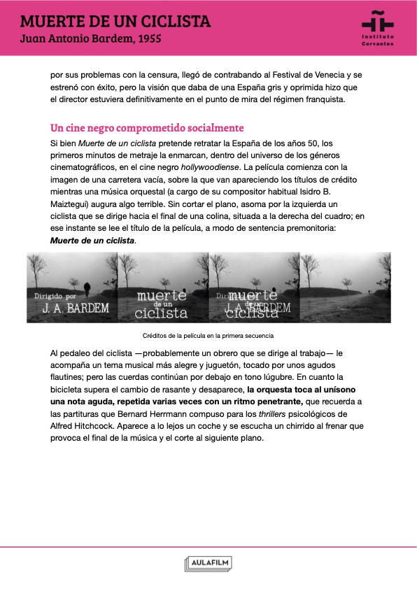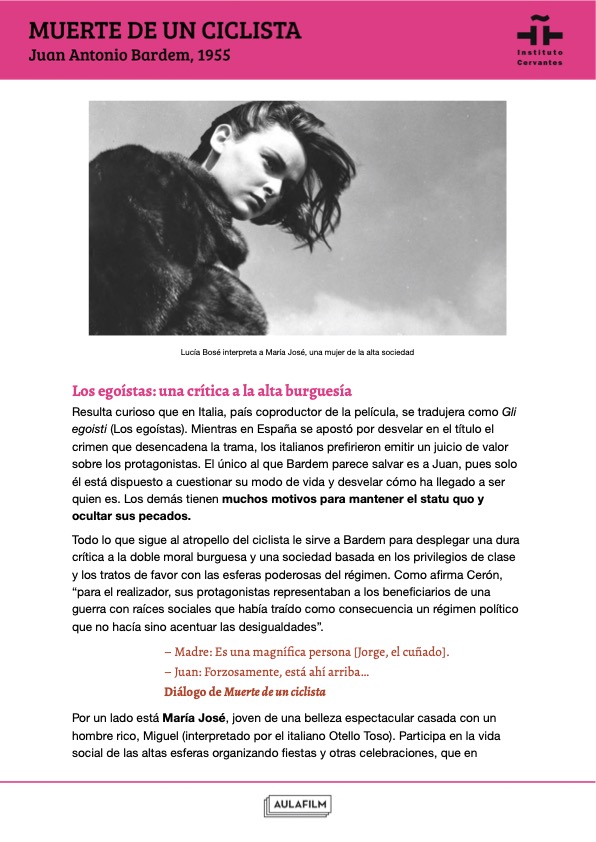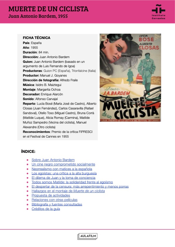 Esta guía pedagógica de Muerte de un ciclista forma parte de una colección de materiales didácticos elaborados para profundizar en el análisis de una selección de películas clásicas y contemporáneas del cine español. Han sido elaboradas por Aulafilm para el Cineclub virtual de la Red de Bibliotecas del Instituto Cervantes: un espacio para el debate y el aprendizaje entre amantes del cine de todo el mundo que propone el visionado de una programación de películas online para debatir a distancia, con debates moderados por expertos y guías que acompañan cada uno de los títulos.