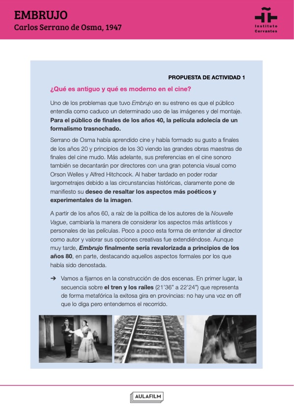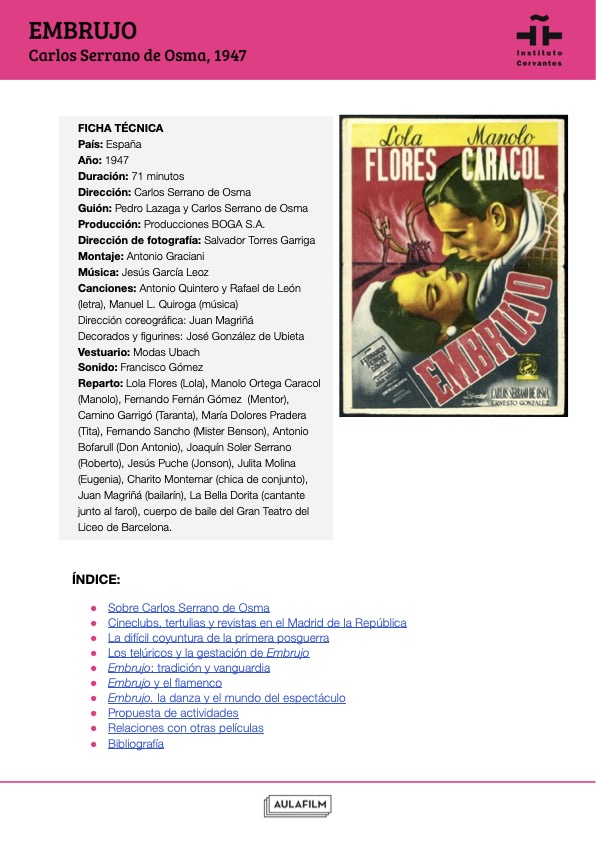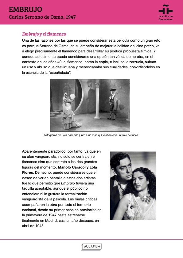 En la edición de 2023, el Instituto Cervantes le rinde homenaje a través de la recuperación de la película Embrujo, dirigida por Carlos Serrano de Osma y protagonizada por Lola Flores y Manolo Caracol, dos estrellas incontestables de la música y el baile flamencos. Desde Aulafilm nos sumamos a la puesta en valor de esta excepcional película a través la elaboración de su guía pedagógica para el Instituto Cervantes.