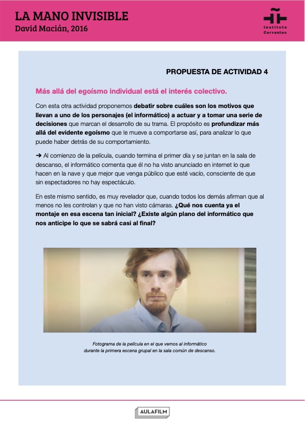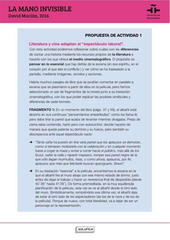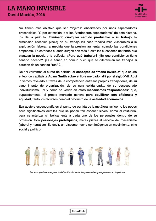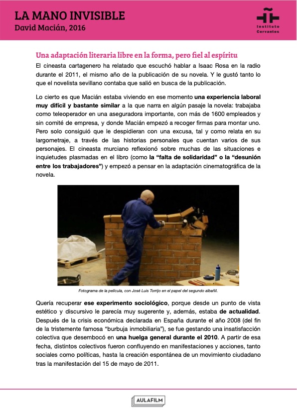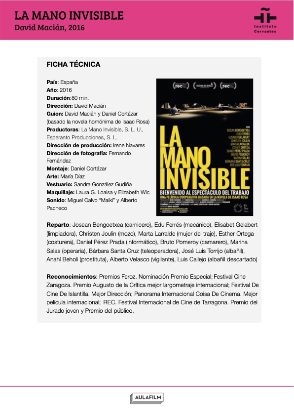 Esta guía pedagógica de La mano invisible aporta claves para realizar un análisis fílmico de la película, acercarse a su contexto cultural y trabajar sobre sus ejes temáticos y tratamiento cinematográfico. Los contenidos y actividades han sido elaboradas por Aulafilm para el Instituto Cervantes y forman parte de una colección de materiales didácticos elaborados para profundizar en el análisis de una selección de películas clásicas y contemporáneas del cine español. Han sido elaboradas por Aulafilm para el Cineclub virtual de la Red de Bibliotecas del Instituto Cervantes: un espacio para el debate y el aprendizaje entre amantes del cine de todo el mundo que propone el visionado de una programación de películas online para debatir a distancia, con debates moderados por expertos y guías que acompañan cada uno de los títulos.