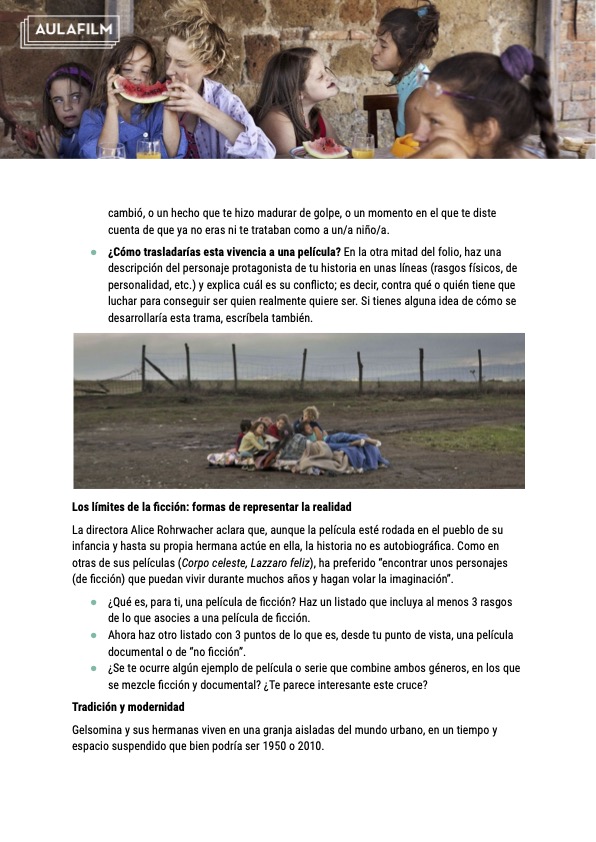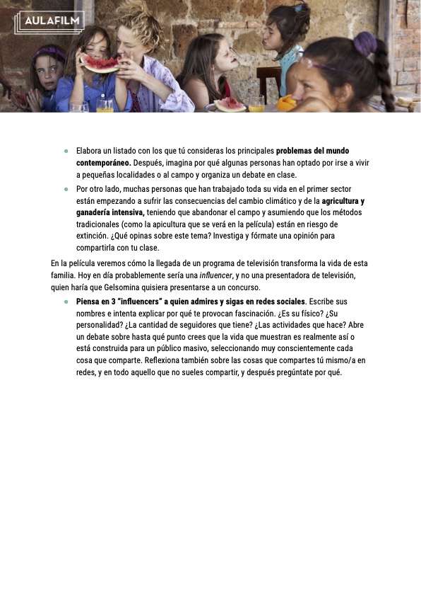- Reflexionar sobre los cambios y retos de la adolescencia a través del análisis de los personajes de la película y su arco de transformación. Analizar los pilares en los que se basa la familia protagonista y estudiar las diferentes estrategias que adoptan Gelsomina y sus hermanas para forjarse un destino propio más allá de los muros de su casa.