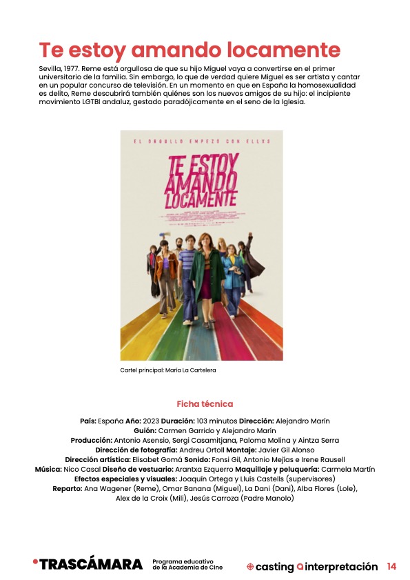 Esta guía aborda las profesiones de dirección de casting e interpretación a través del análisis de la película Te estoy amando locamente (Alejandro Marín, 2023), y busca ofrecer a profesorado y estudiantes una herramienta para aproximarse a los oficios del cine entendidos como profesión, creación colectiva y expresión artística.