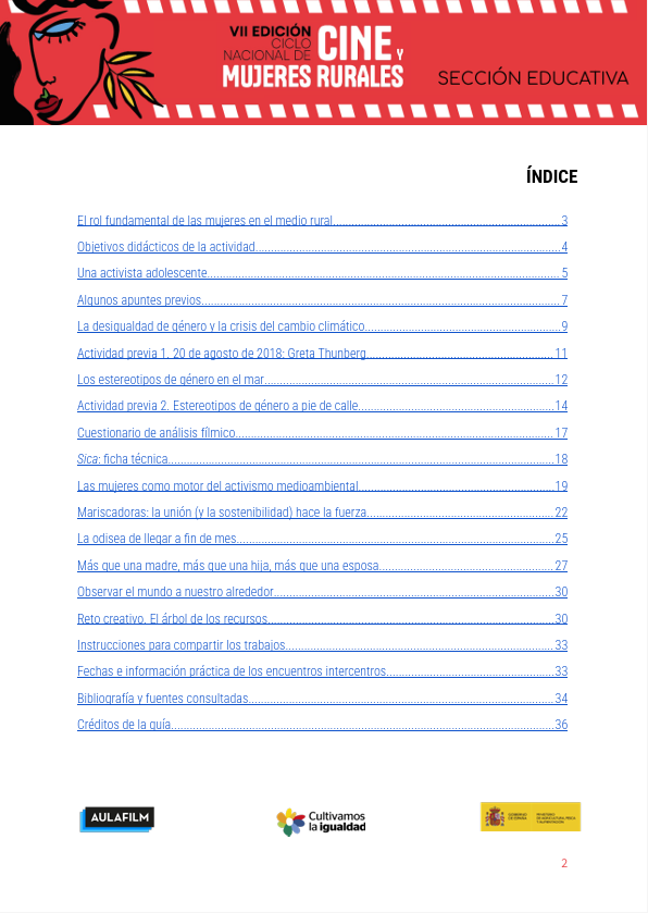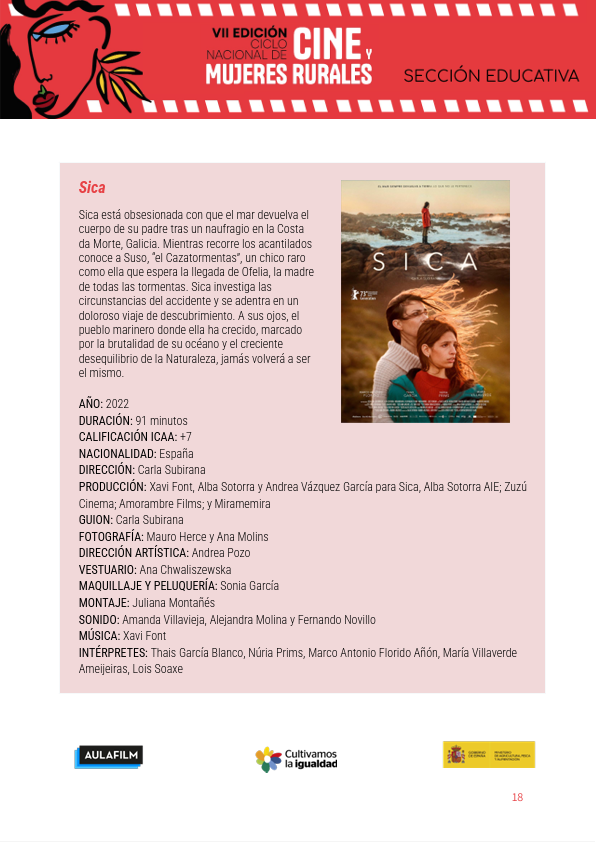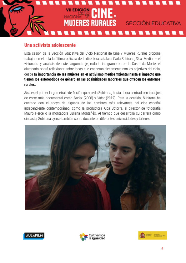 La guía pedagógica de Sica busca acercar a las y los jóvenes representaciones diversas de las mujeres en el entorno rural y promover el desarrollo de una mirada crítica y reflexiva sobre el tratamiento de sus personajes en el cine. Forma parte de los materiales de la Sección Educativa del Ciclo Nacional de Cine y Mujeres Rurales, impulsada por el Ministerio de Agricultura, Pesca y Alimentación y facilitada por Aulafilm.