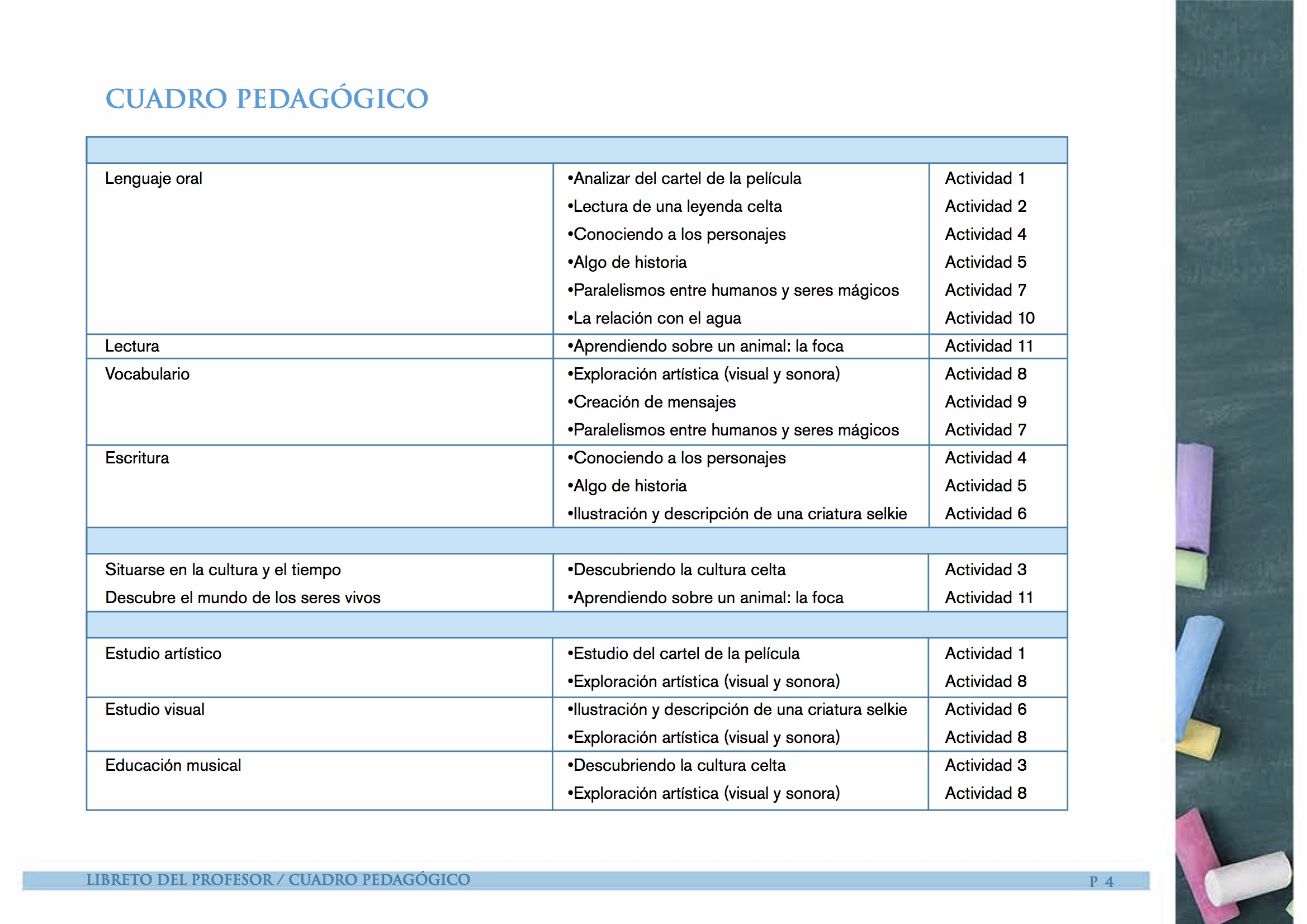 La película es ideal para niños entre 6 y 12 años y su estudio sugiere distintas vías de trabajo, sobre todo para descubrir a los alumnos la rica cultura celta.