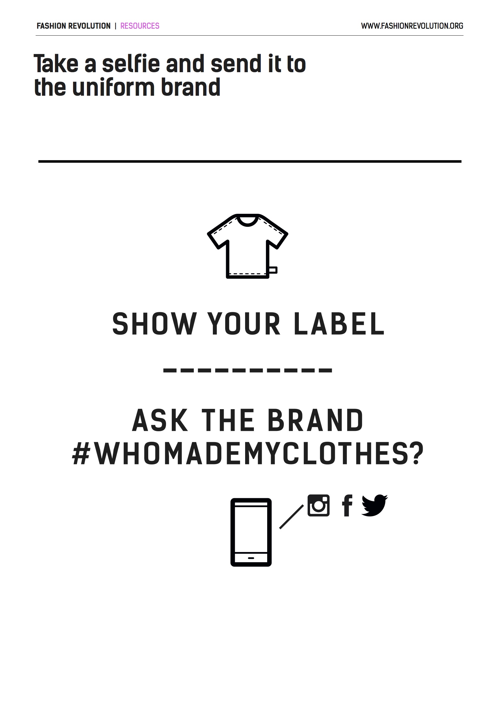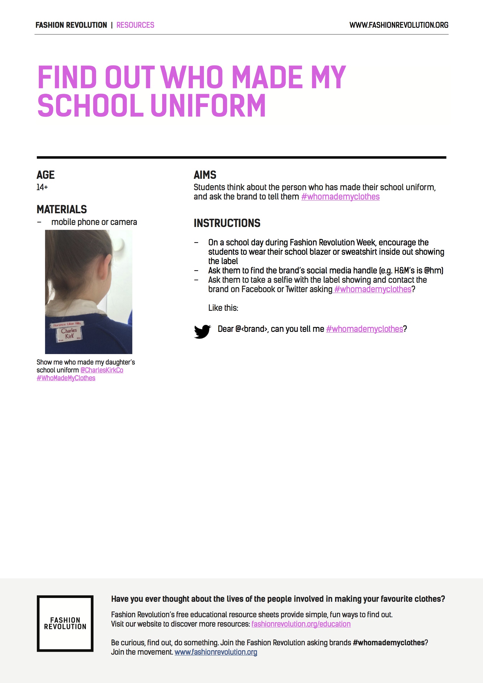 Descargar archivoCon este archivo (PDF - 169 KB) los estudiantes pensarán en la empresa que ha hecho su uniforme escolar para pedirle a la marca que les diga #whomademyclothes.