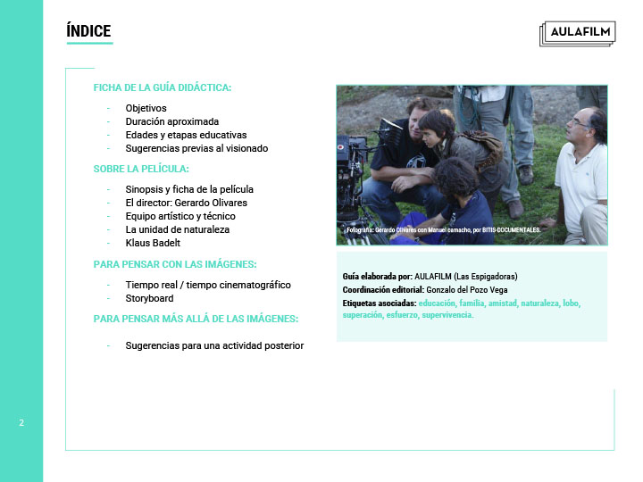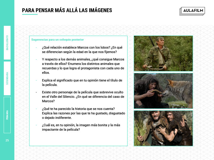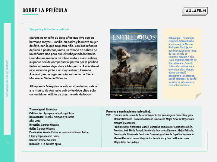Los alumnos y alumnas visionarán una película basada en una historia real, en la cual un niño de su edad se ve obligado a vivir en plena naturaleza, teniendo como compañeros a un hurón, un lobo y un búho real. A través de esta historia trataremos diversos temas de educación ambiental, que tienen como objetivo que el escolar conozca el rico patrimonio natural de nuestra península, aprendiendo a valorarlo y respetarlo. A través de este recurso pedagógico descubriremos también algunas anécdotas sobre el rodaje con animales salvajes, analizaremos el storyboard de la película y aprenderemos las diferencias entre el tiempo cinematográfico y el tiempo real.