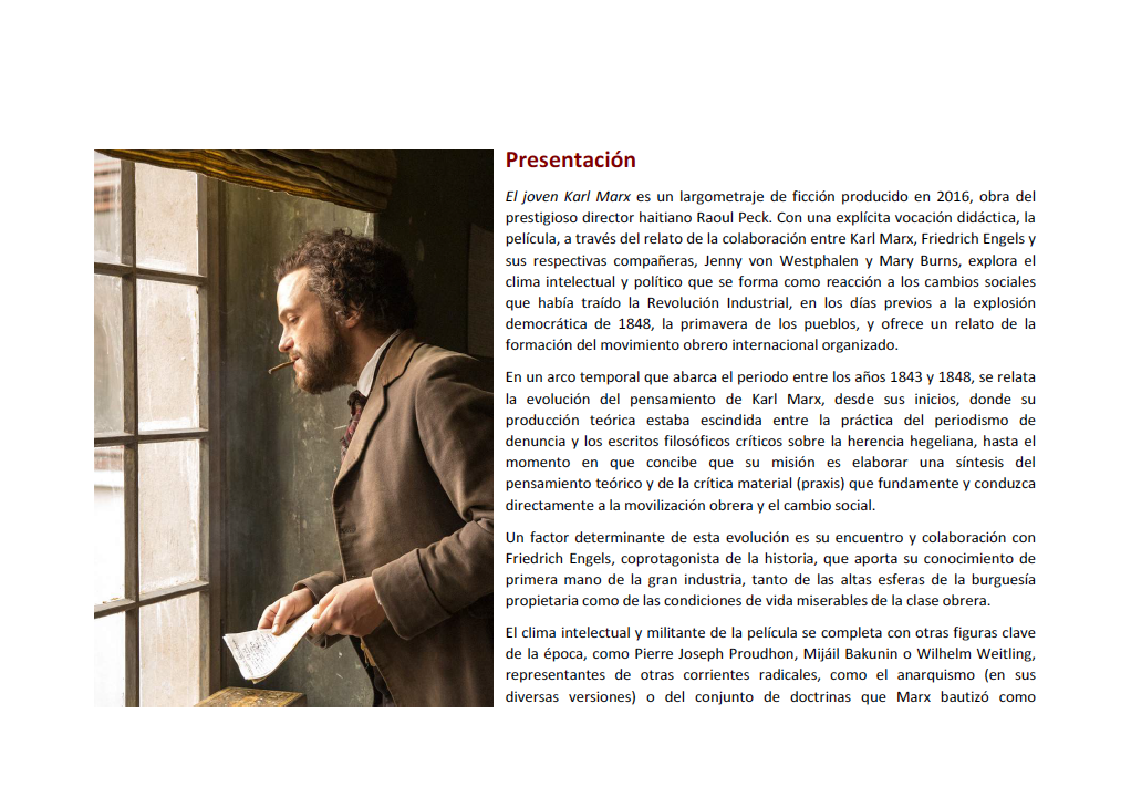 La película narra el momento en que un joven Karl Marx viaja a París, lugar donde finalmente publicará en 1848 el Manifiesto Comunista. Allí conoce a Friedrich Engels, compañero en el liderazgo de la lucha del movimiento obrero.