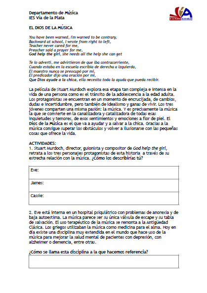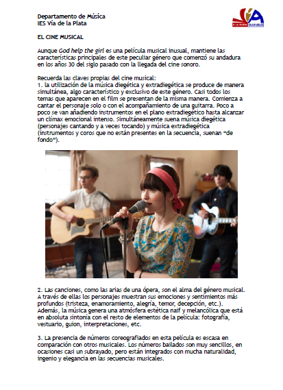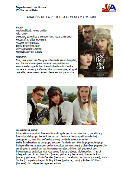 El docente Álvaro Málaga, del departamento de Música del IES Vía de la Plata (Guijuelo, Salamanca), ha desarrollado una propuesta pedagógica en torno a la película God Help The Girl (Stuart Murdoch, 2014) para analizar el cine musical, la música popular contemporánea, los entresijos de la industria musical o el uso terapéutico de la música en las personas.