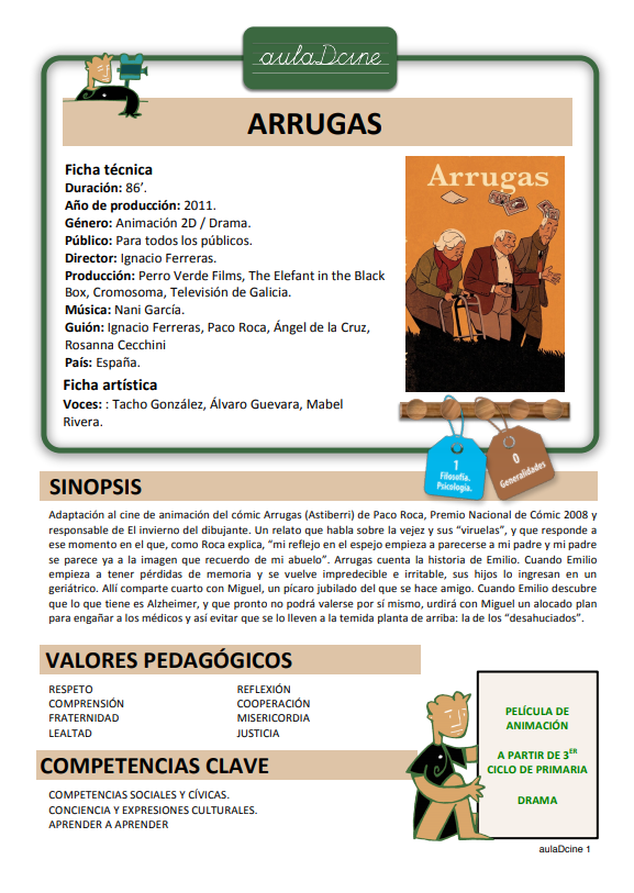 Adaptación al cine de animación del cómic Arrugas de Paco Roca, ganador del Premio Nacional de Cómic 2008 y responsable de El invierno del dibujante. Un relato que habla sobre la vejez y sus “viruelas”, y que responde a ese momento en el que, como Roca explica, “mi reflejo en el espejo empieza a parecerse a mi padre y mi padre se parece ya a la imagen que recuerdo de mi abuelo”.